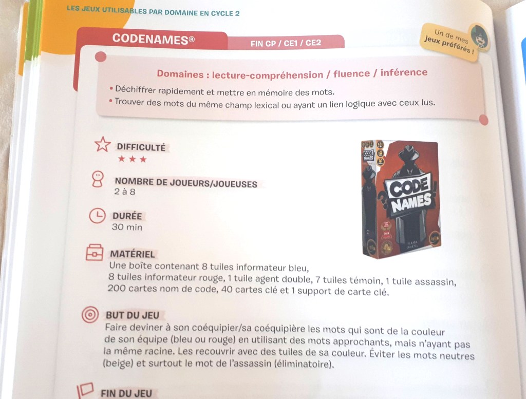 Sur chaque fiche, vous avez le domaine de compétence visée, la difficulté à comprendre les règles, le nombre de joueurs, la durée, le contenu, le but du jeu et un lien vers la présentation du jeu sur Youtube. Vous allez trouver environ 80 fiches pratiques qui vous donneront un bon aperçu du catalogue des jeux ludiques sur le marché ! On y trouve aussi quelques fiche de jeux à télécharger gratuitement sur divers blogs d’enseignants.